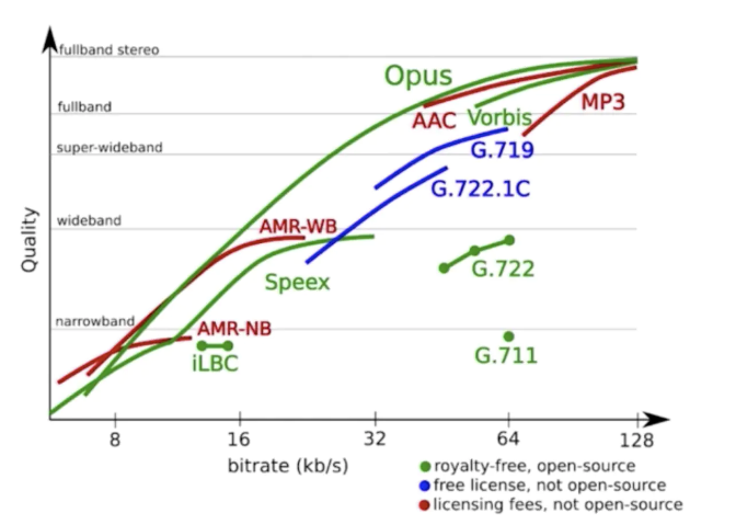 下圖為音頻編解碼器性能對比,橫坐標(biāo)是碼率,縱坐標(biāo)是音頻的采樣大小等級劃分(比如采樣大小為8bit是窄帶音頻,采樣大小為16bit是寬帶音頻)。